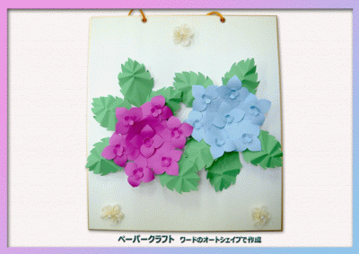 | アジサイのペーパークラフト <ワード> MHさん ワードの図形(オートシェイプ)を使って作成 色紙に飾り付けた作品 |